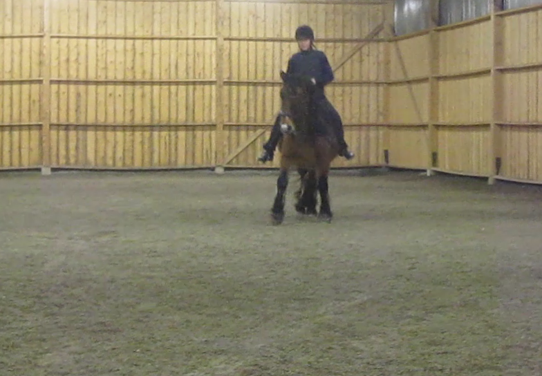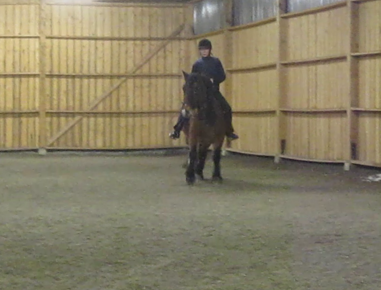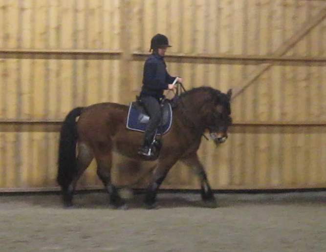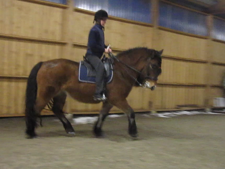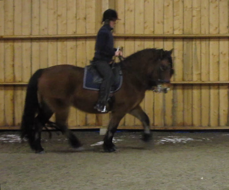 Uppdatering 2015 12 26 Min store drummel! Blixt är en häst som gör mig glad. Han rids nu regelbundet. Blixt börjar hitta sin linjering och bär sig allt bättre. Fortfarande blir han lätt framtung och faller isär. Hans tonus är fortfarande oftast låg, vilket självklart försvårar för honom. Samtidigt är han ju så angelägen om att göra rätt och då måste han koncentrera sig och placera fötterna med bibehållen balans. Tonus kommer med styrka. I god balans kan vi åstadkomma bra skolor i skritt och trav. Samling mot skolskritt är påbörjad. Vi leker ibland med galoppanslag, mest för att skapa energi.
