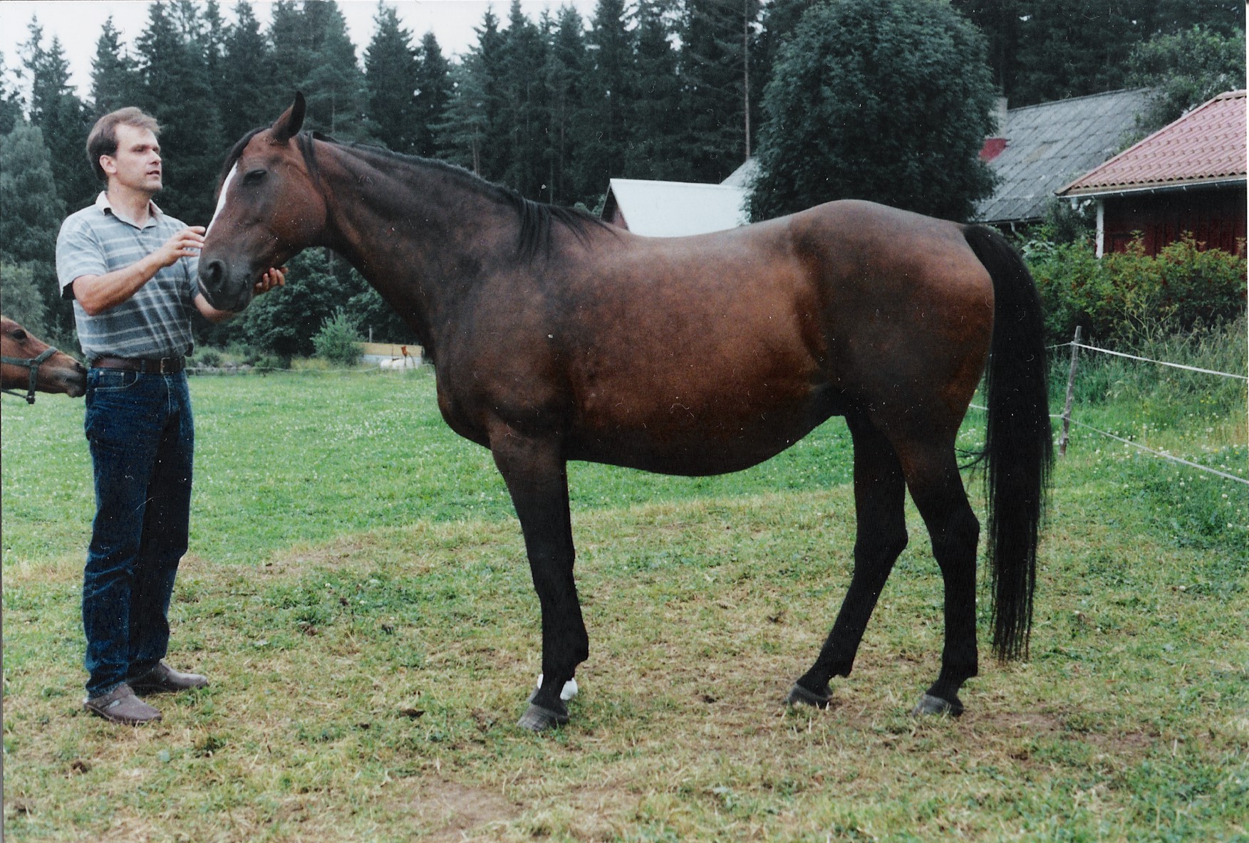 Ronnys första häst. En mycket personlig och minst sagt speciell häst. Ingen häst varken förr eller senare har sett så farlig ut, när det kom in främmande män i stallet. Med öronen tätt bakåtstrukna, vilt stirrande ögon, som såg ut trilla ur sina hålor ( som bara en arabkorsning kan) uppspärrade käkar och våldsamma utfall över boxkanten med tänder som klapprade ihop 30-50 cm från ”inkräktarens” ansikte, kunde han skrämma slag på vem som helst. När vi då gick fram och frågade i mild ton vad han menade, så vände han bort ansiktet och blängde med ena ögat. Mot oss var han alltid smeksam som en kattunge och absolut pålitlig i alla lägen. Han var modig och gick fram överallt. I skogen (obanad terräng) kunde Ronny hålla ner gammal taggtråd, be ”Pyton” att försiktigt kliva över och vänta på andra sidan. Tillsammans klättrade de uppe på stenmurar när det behövdes eller gick genom kärr och myrstackar. Att hoppa hinder däremot var något han bara inte gjorde. Inte ens 20 cm högt. Blixtsnabb och smidig som en katt slingrade han sig ur åt vilket håll som helst. Full fart med bjudning mot hindret, tvärnit, kast höger/vänster/höger/vänster. Om man fortfarande satt kvar i sadeln kunde hela spektaklet följas helomvändning 180 grader. Sen satt man definitivt någon annanstans och det var inte i sadeln. Han gav oss många roliga minnen.